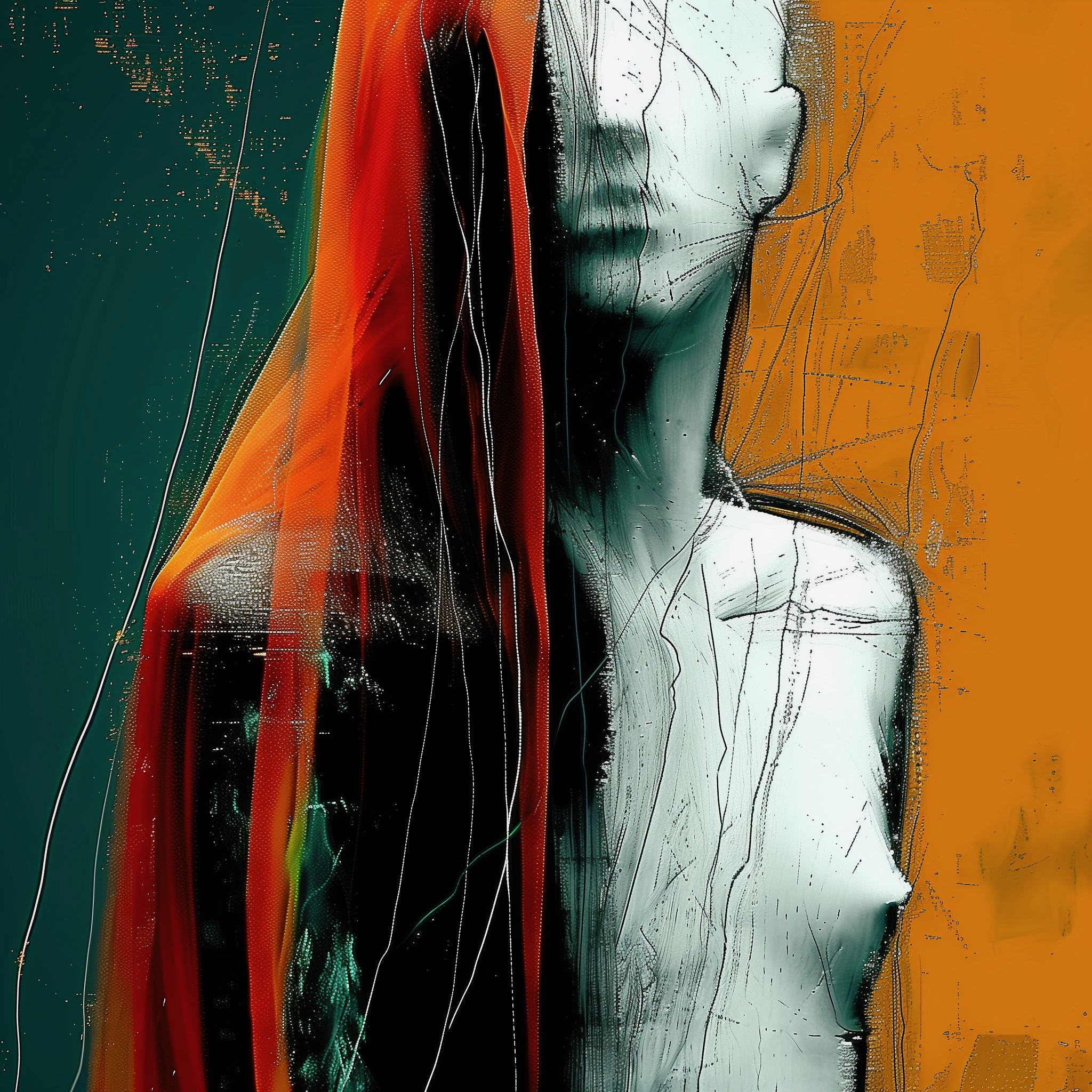 This collection captures the volatile edge where the self fractures and refuses to disappear. Each figure stands between forces—between fire and ash, silence and confrontation. The compositions are cleaved by streaks of black, red, and gold; their bodies partially veiled, their faces split or shadowed. Though the figures remain still, the surrounding space crackles with tension—like a surface struck by lightning, or a landscape unsettled by memory.